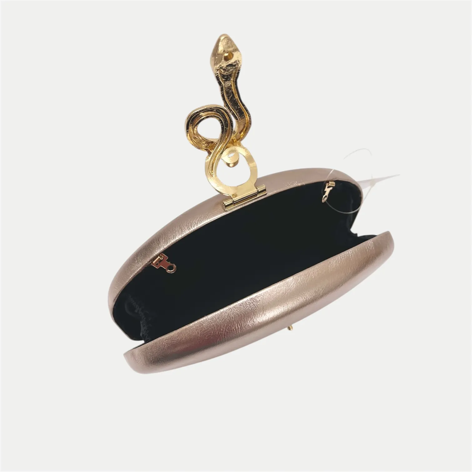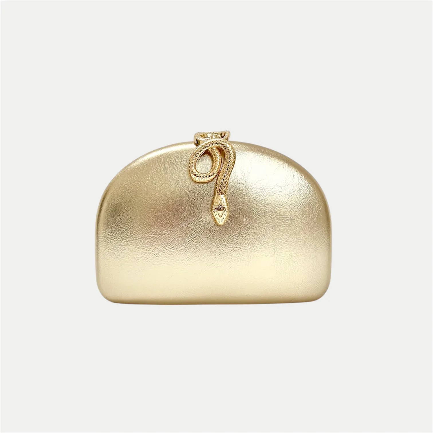 A timeless statement piece designed to elevate every look. The MIRAYYA ROYALE Clutch features a sleek metallic body paired with a striking serpent-inspired clasp that adds a touch of bold elegance. Designed for versatility, it comes with a detachable sling strap, allowing you to style it as a clutch, handbag, or sling.