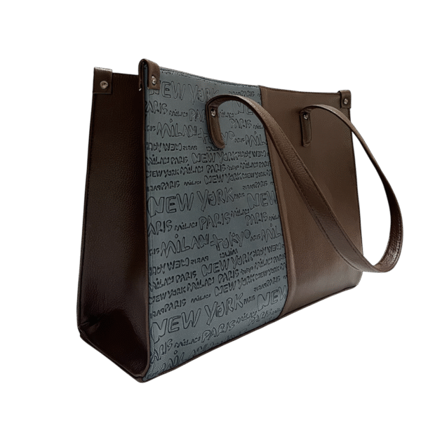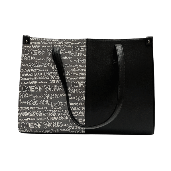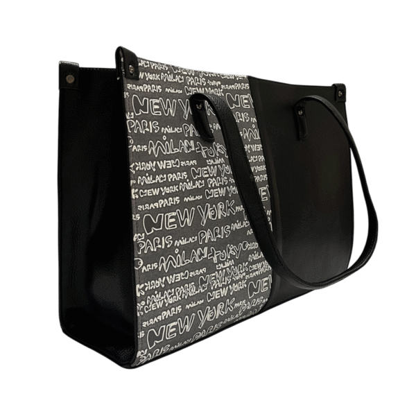 Its standout feature? A handwritten-style city print — featuring New York, Paris, and Milan — wrapped around the center panel, giving your outfit instant character. Made with smooth vegan leather and matte side panels, it’s built to carry your everyday with ease.