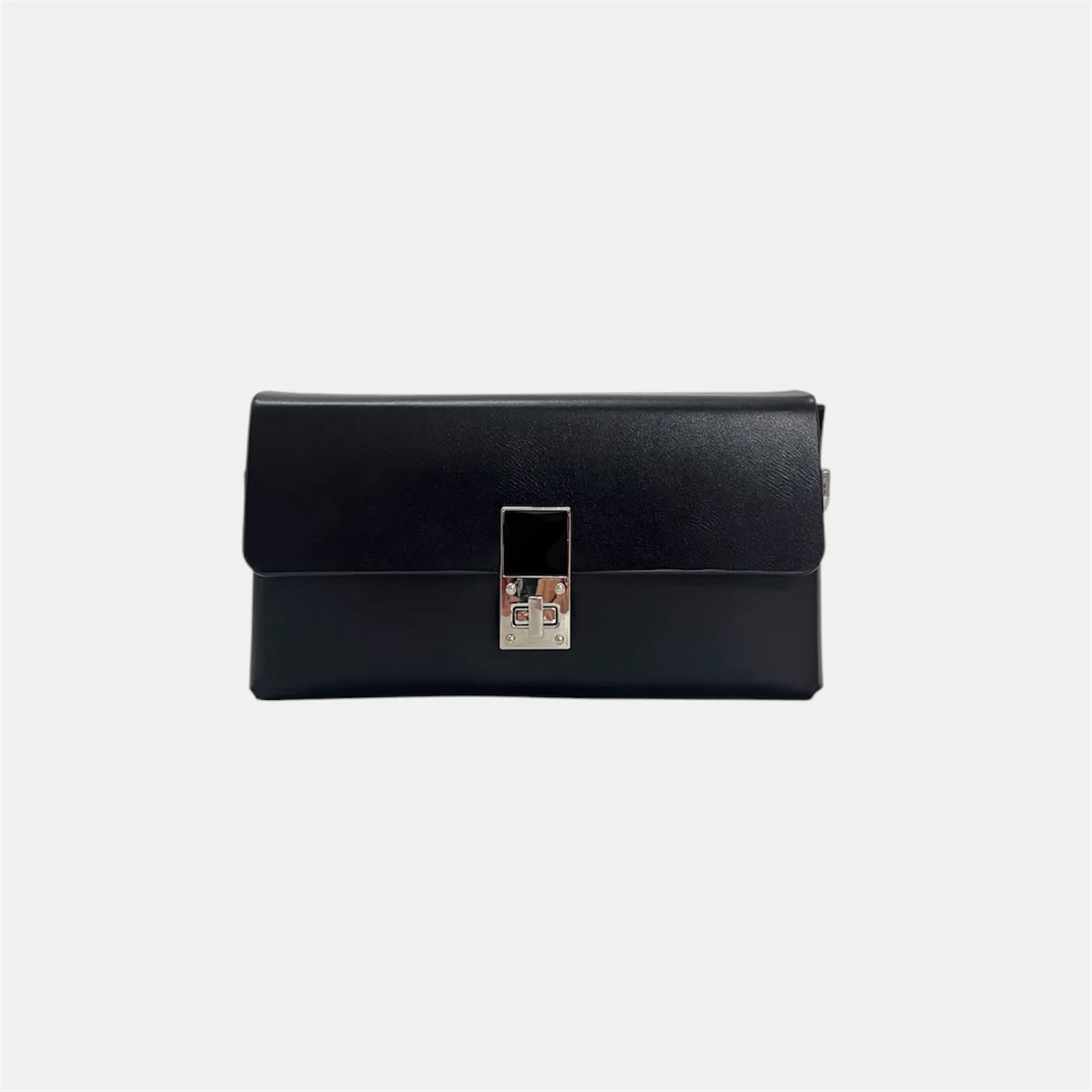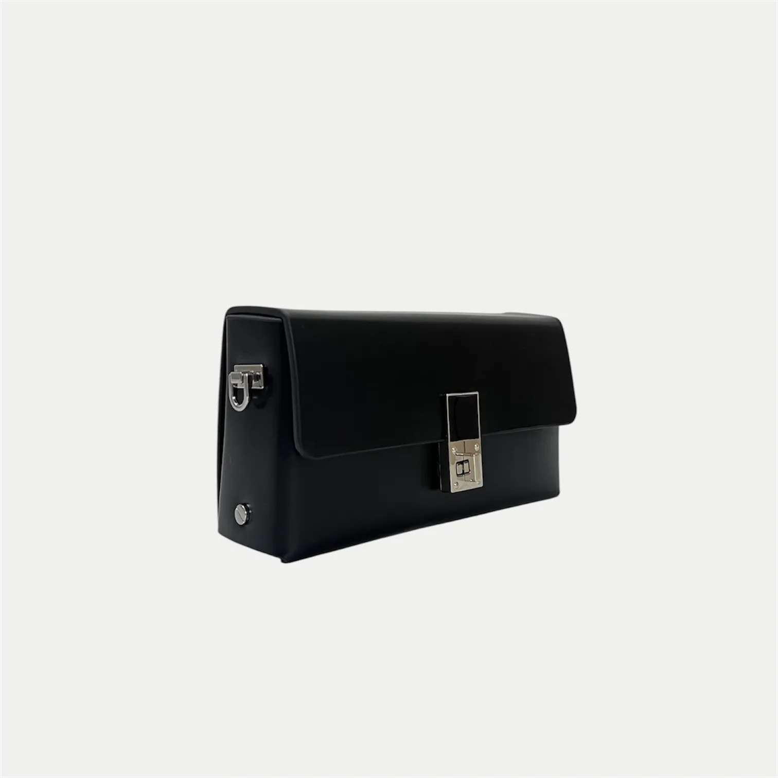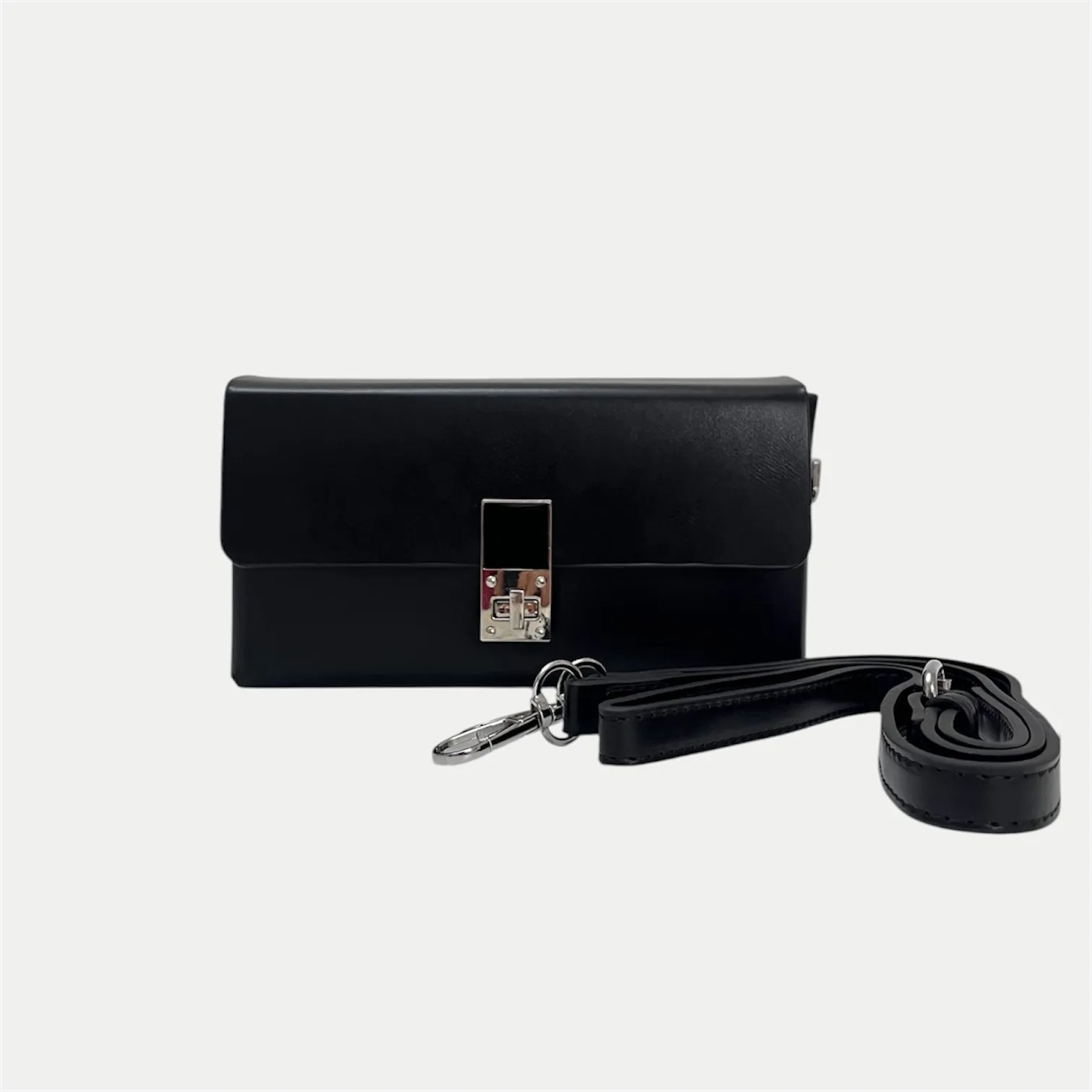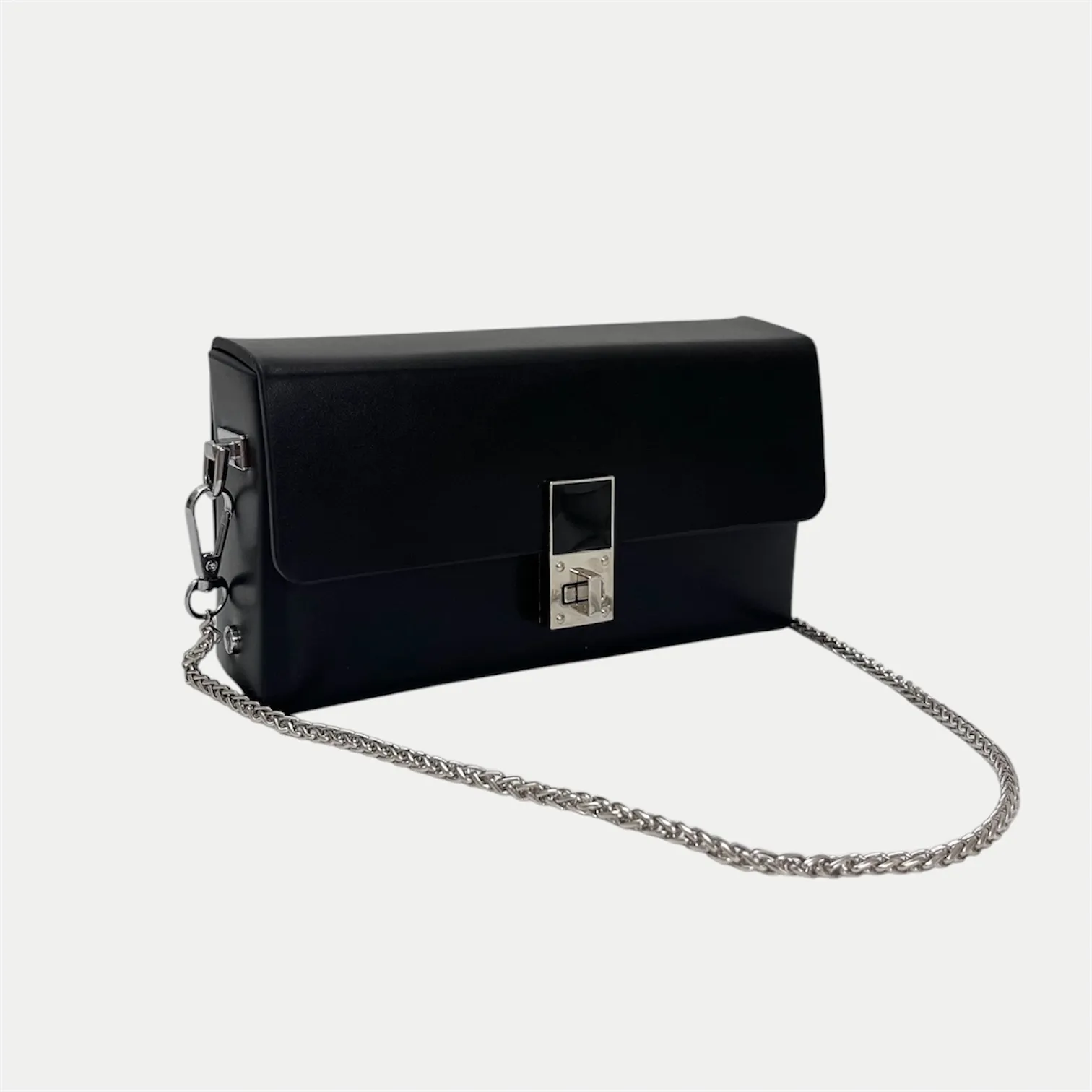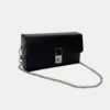 A sleek black sling with a structured silhouette and signature lock detail, featuring dual straps—chain and belt—for effortless day-to-night styling.