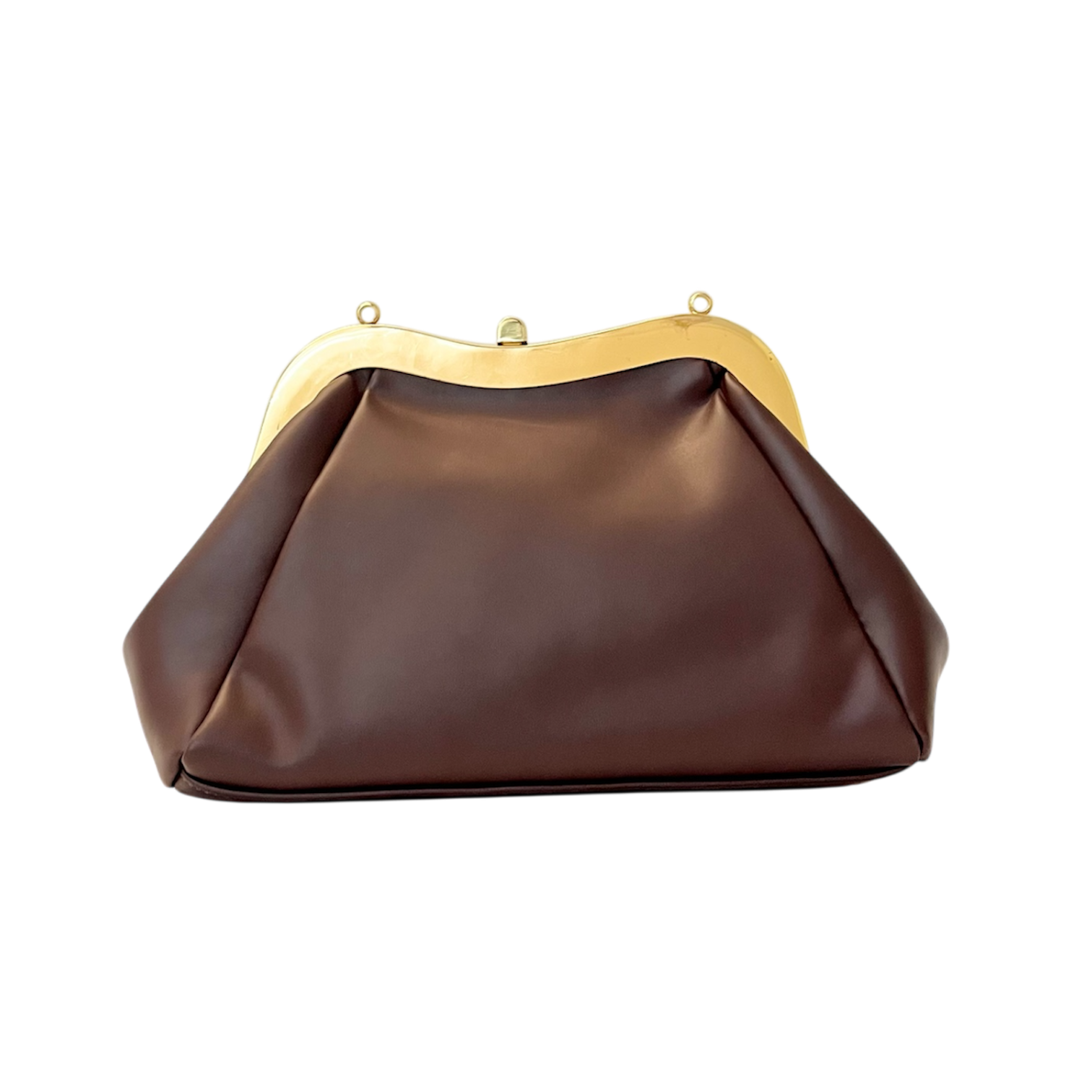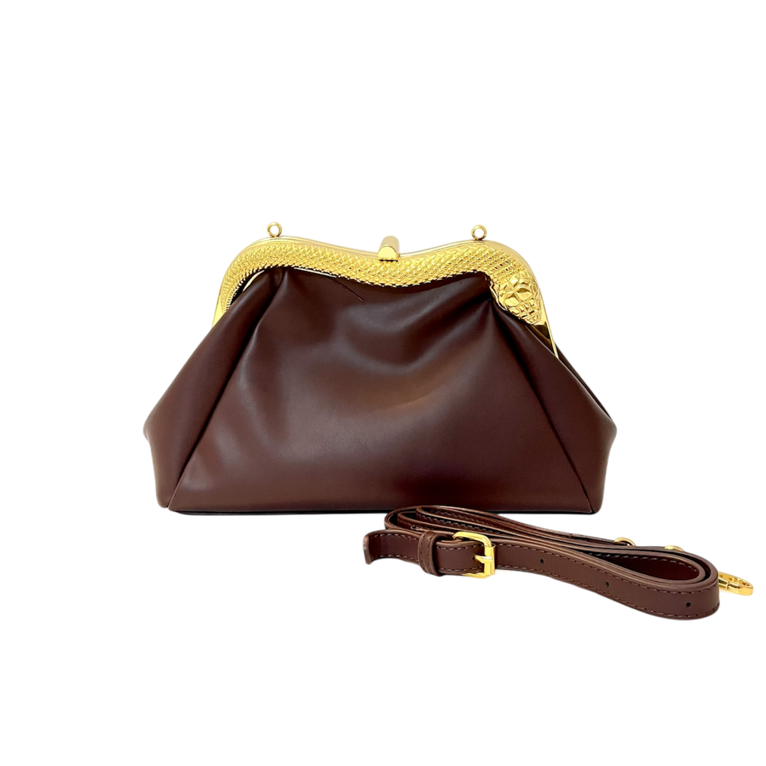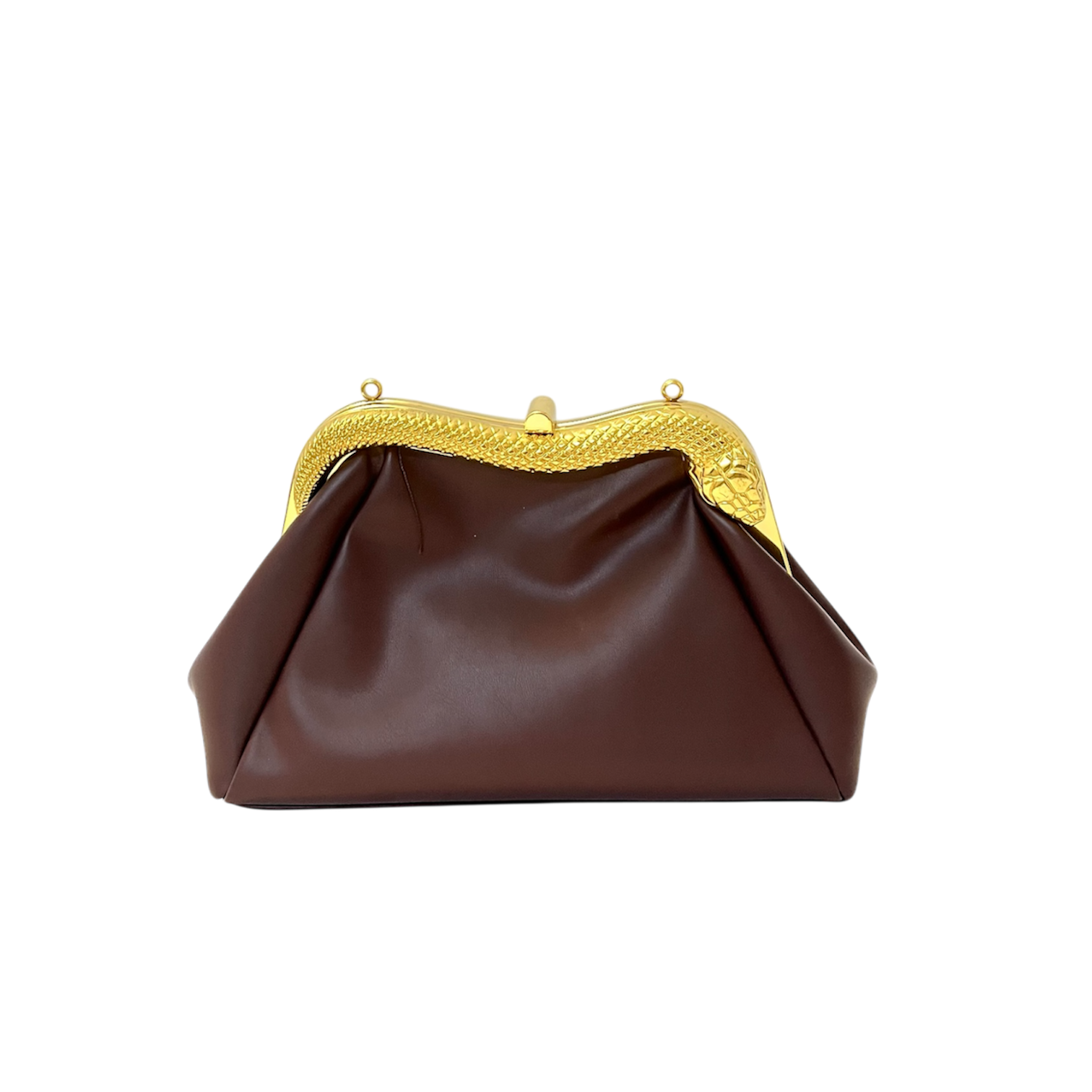 Exuding elegance and timeless charm, the GOLDEN HOUR CLUTCH by Mirayya is your perfect companion for evening soirées and dinner nights. Crafted in rich brown with a sculpted silhouette and a statement gold frame, it brings together sophistication and modern luxury. The detachable sling offers versatile styling — carry it as a chic clutch or wear it crossbody for effortless grace.